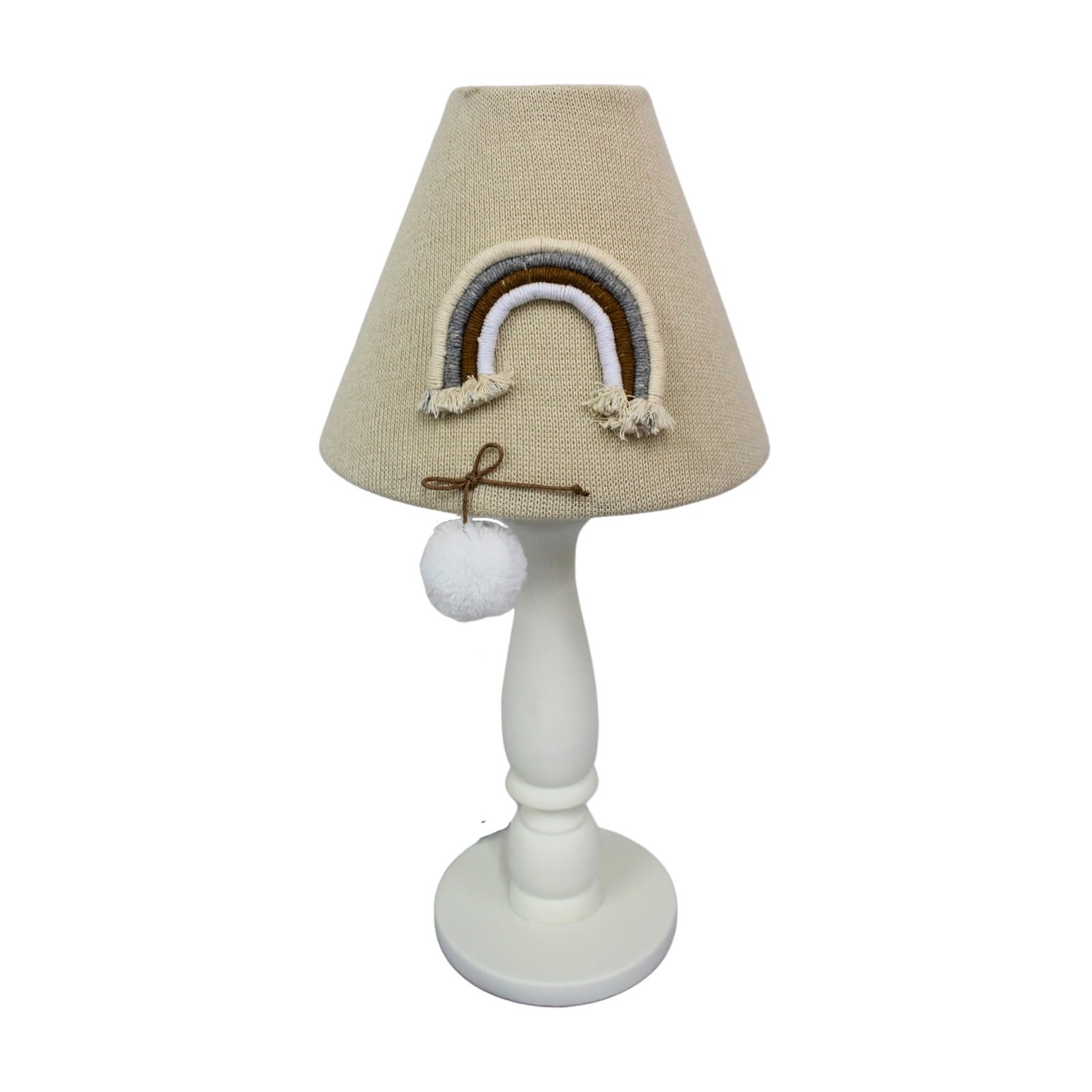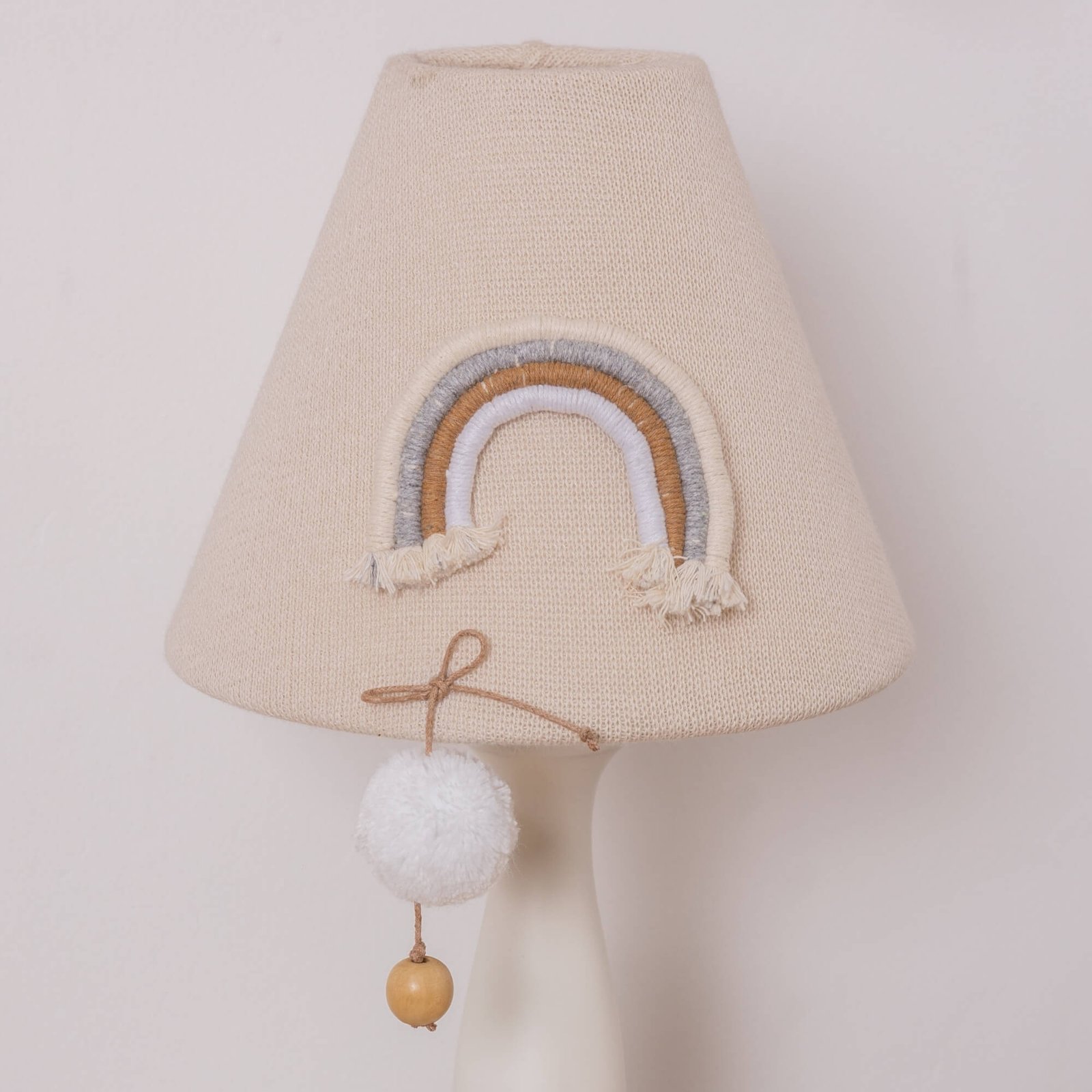 - 01 Abajur com base branca em MDF e cúpula revestida em linhão, com detalhe arco íris handmade em linha com pompom – 41cm x 21cm