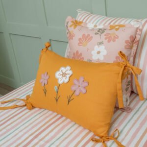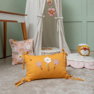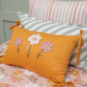 • 01 Almofada em tricoline mostarda com bordados de flores e laços nas pontas – 50cm x 35cm
