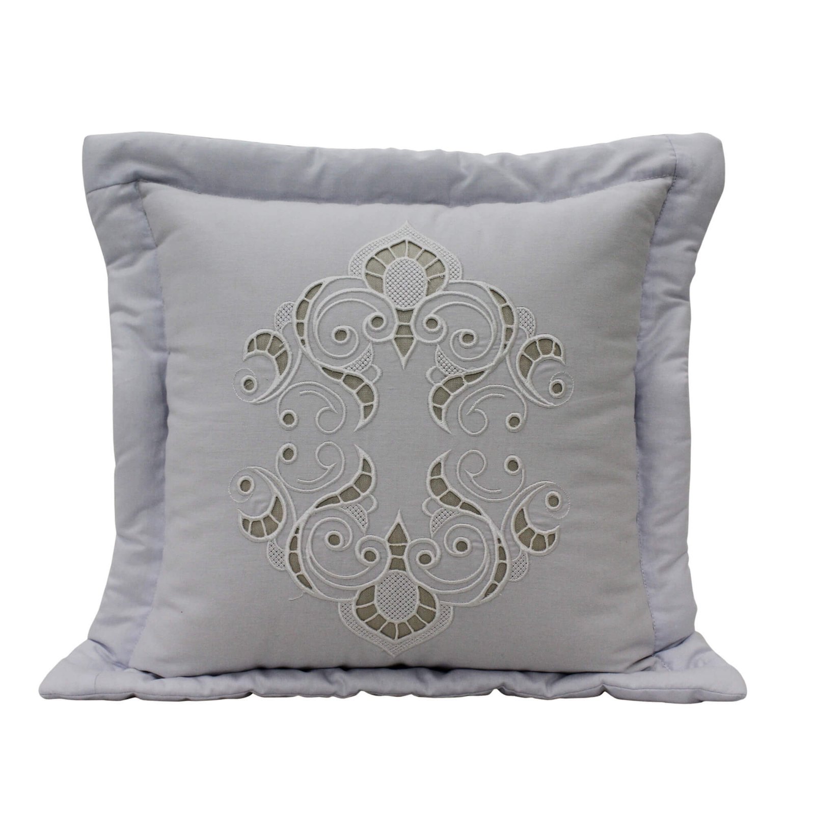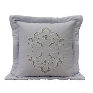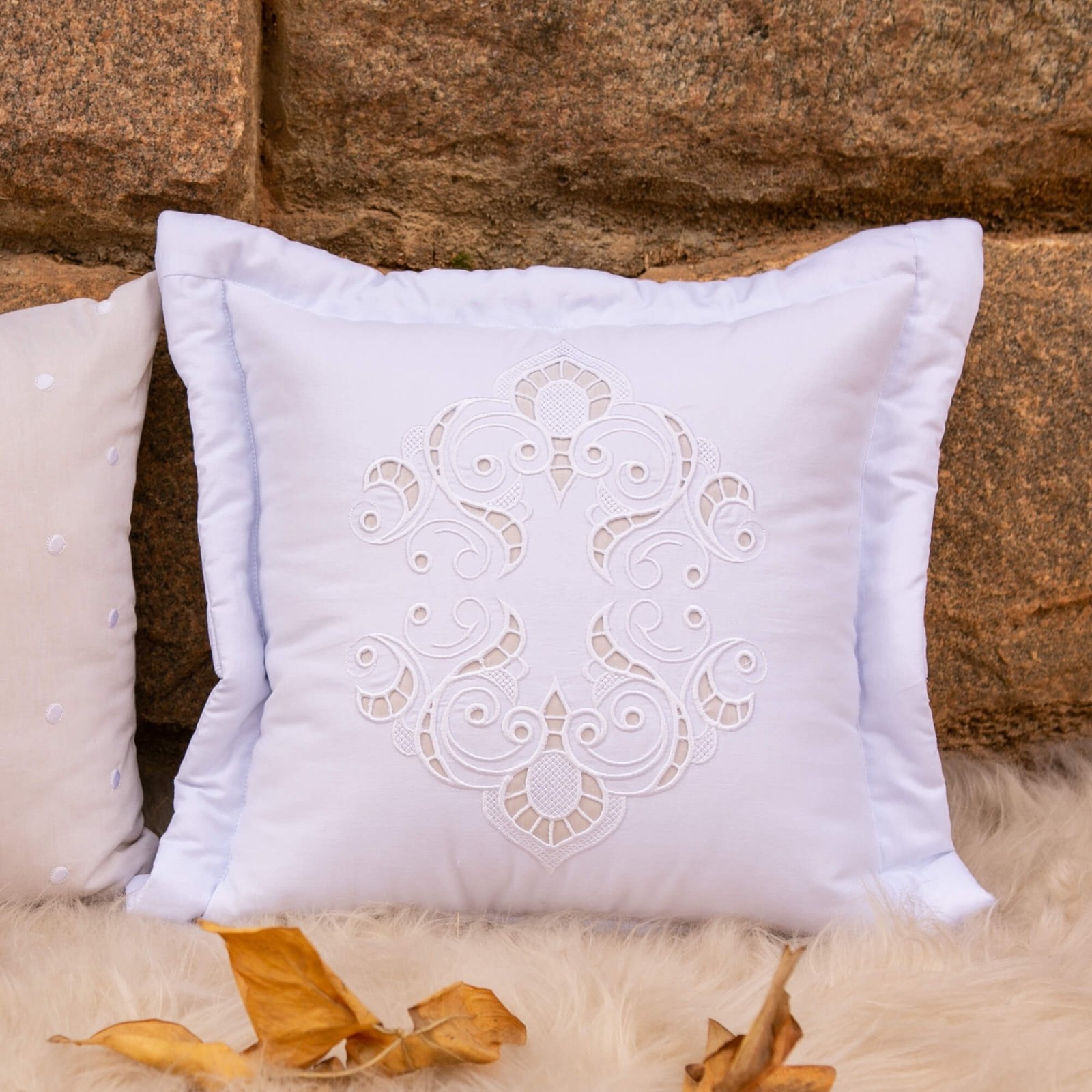 - 01 Almofada em percal branco 200 fios com fundo em oxford bege, bordada arabesco em richelieu, possui borda – 42cm x 42cm + borda
