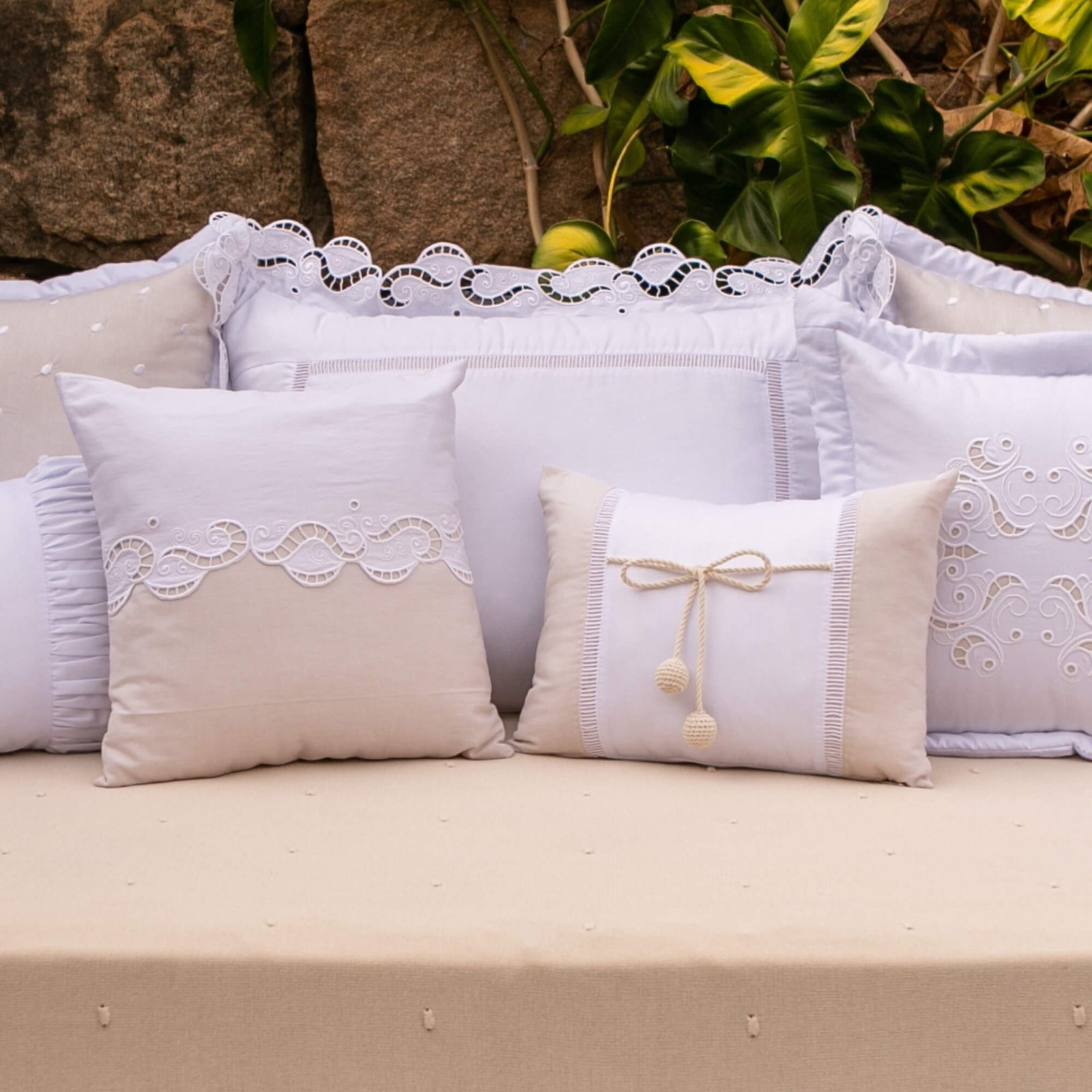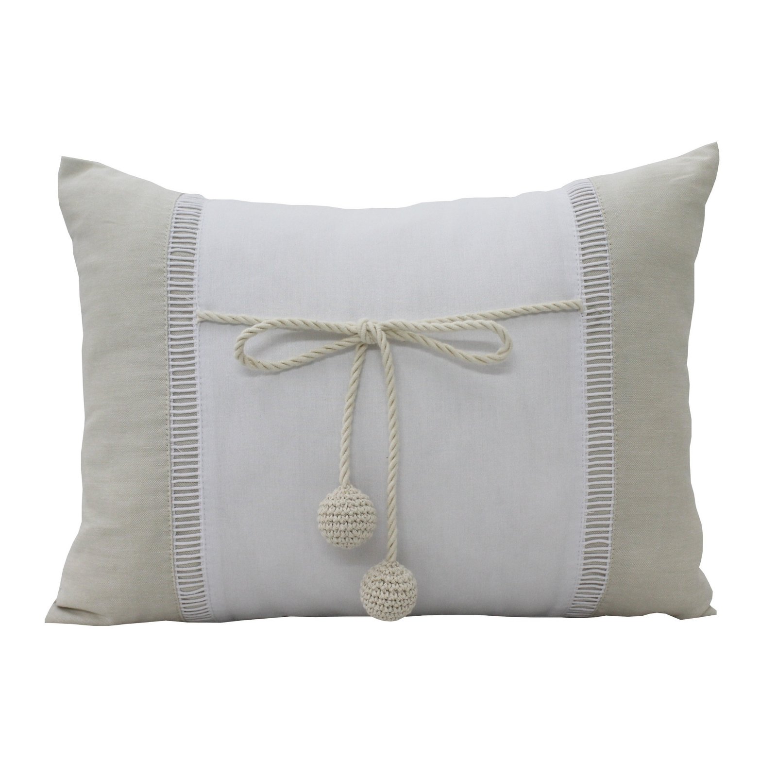 • 01 Almofada com centro em percal branco 200 fios e laterais em oxford bege, possui detalhes de ponto palito e cordão rústico com bolinhas handmade – 37cm x 25cm