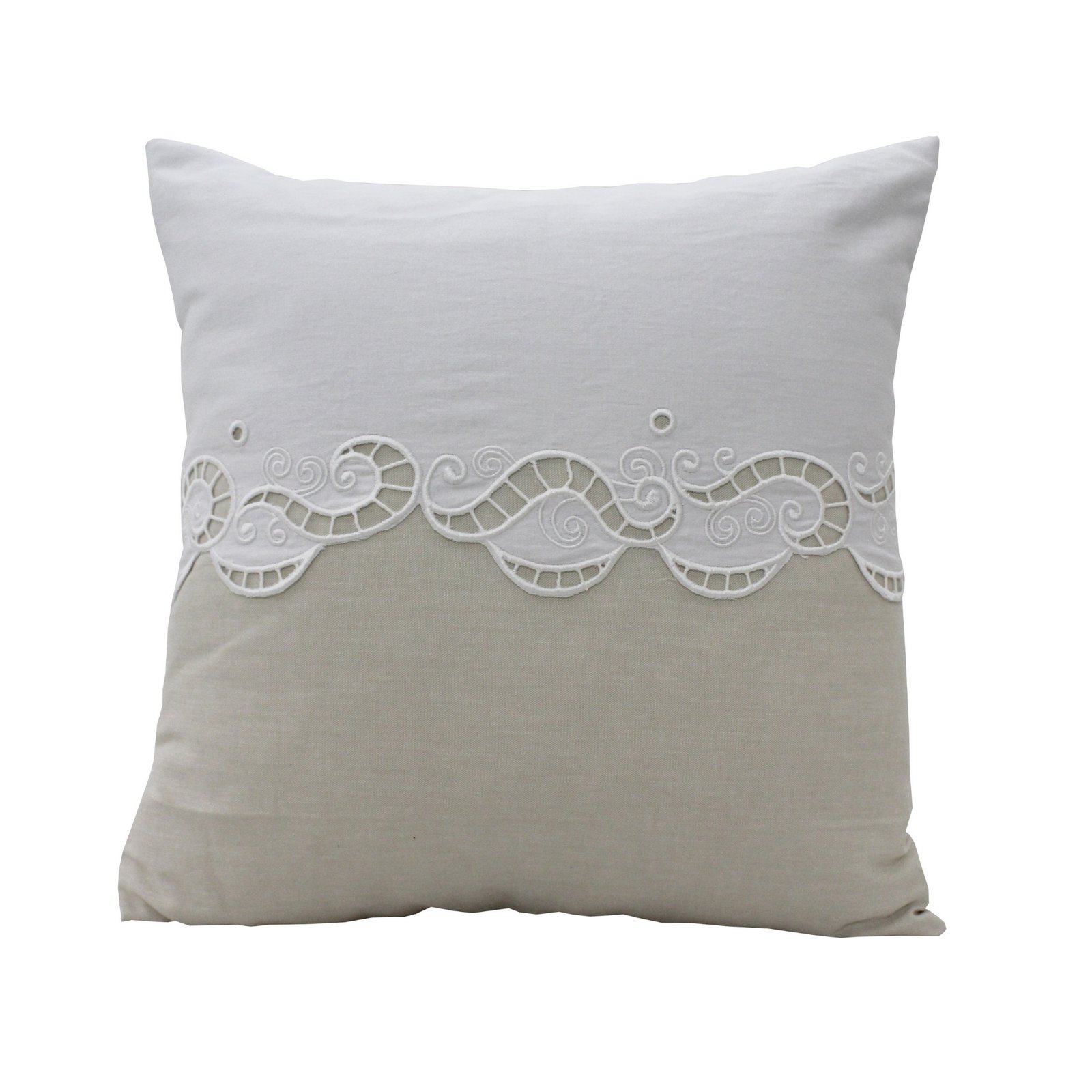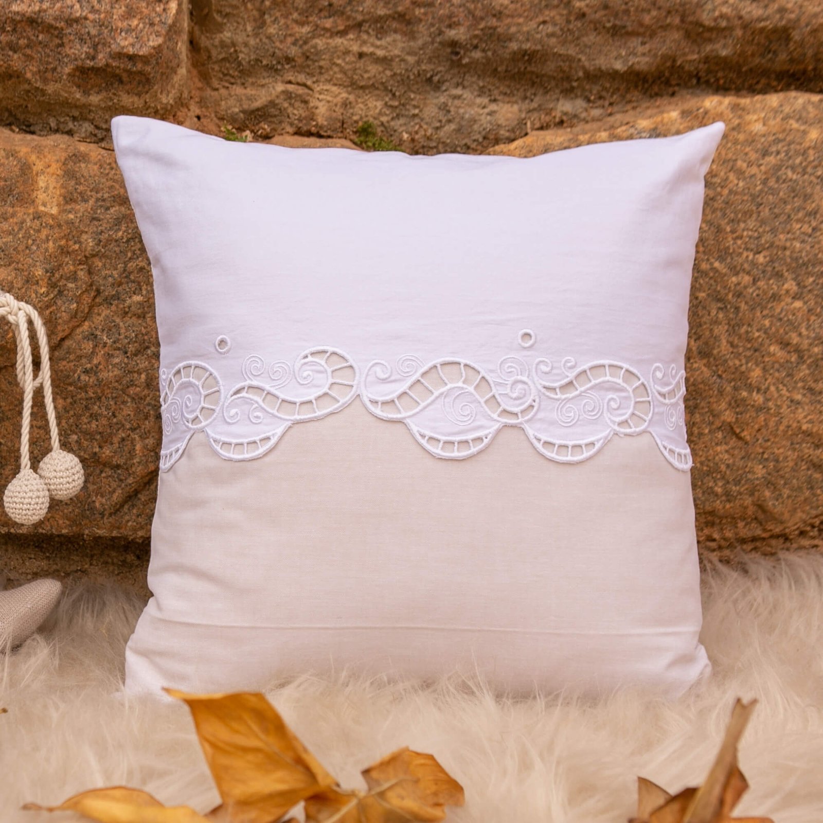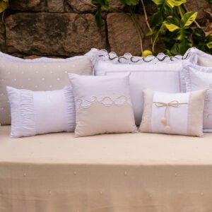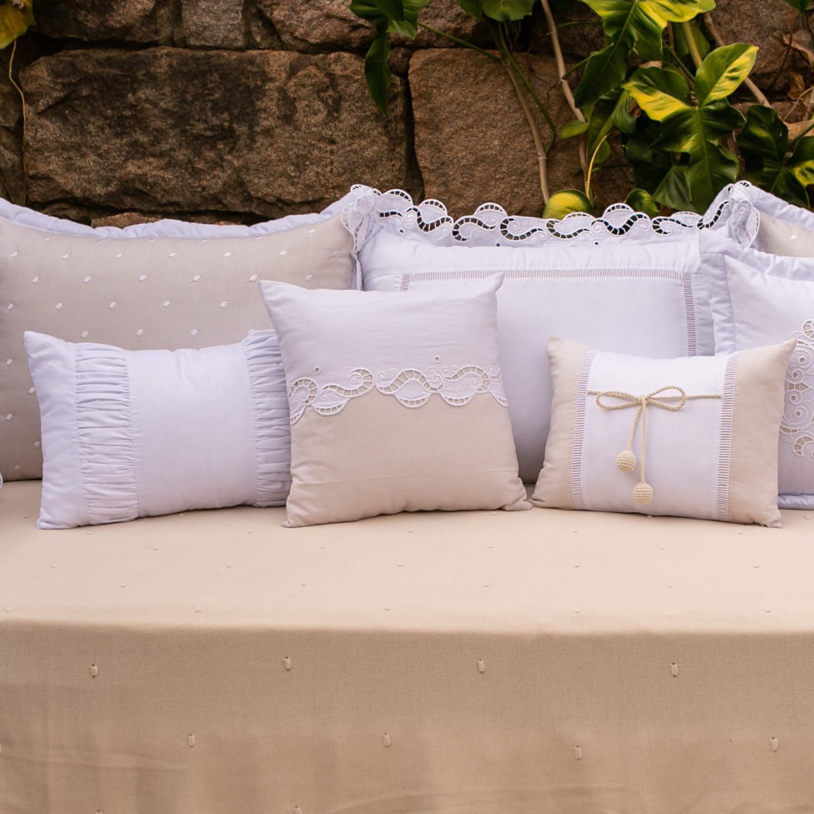 - 01 Almofada metade em oxford e metade em percal branco 200 fios com detalhe bordado richelieu – 35cm x 35cm