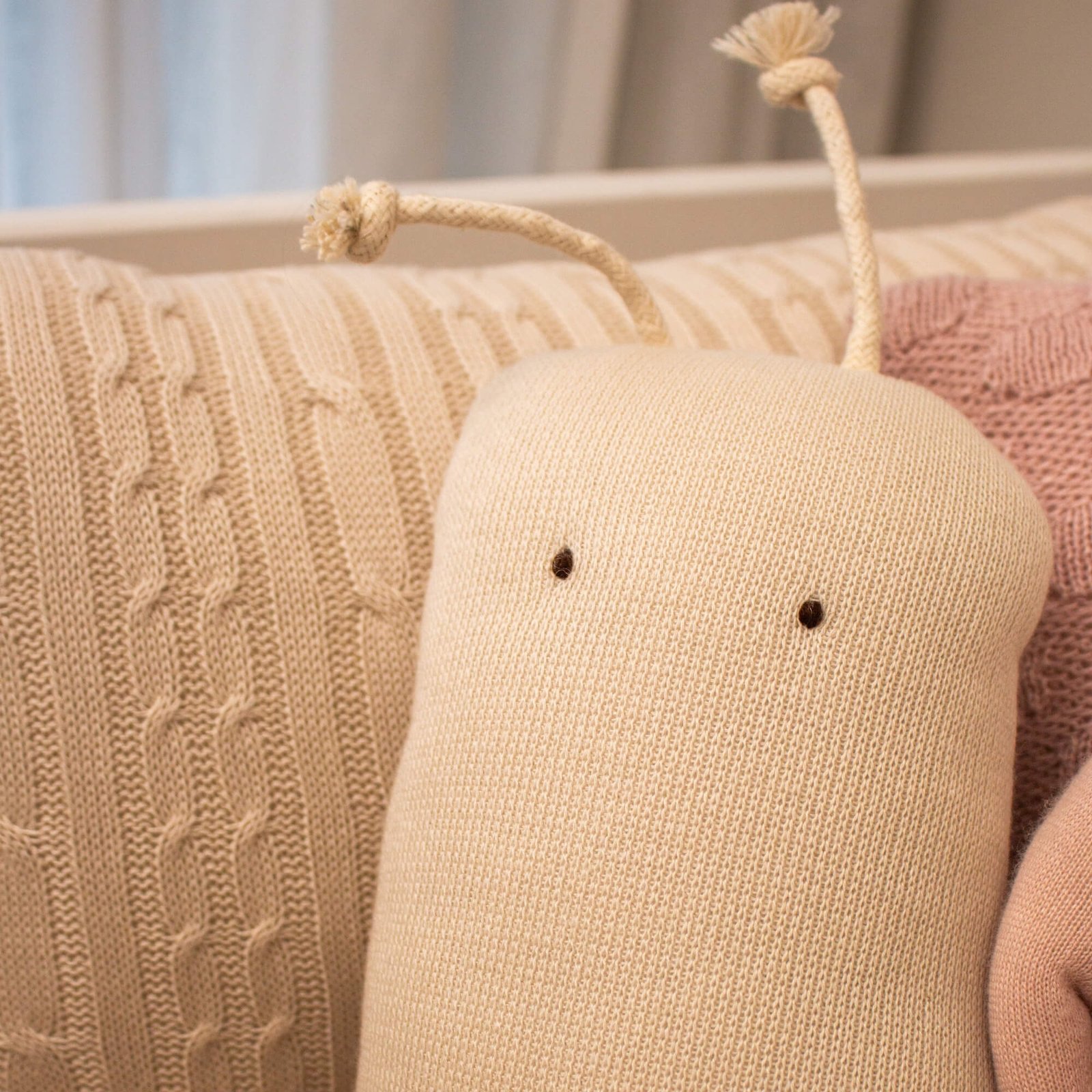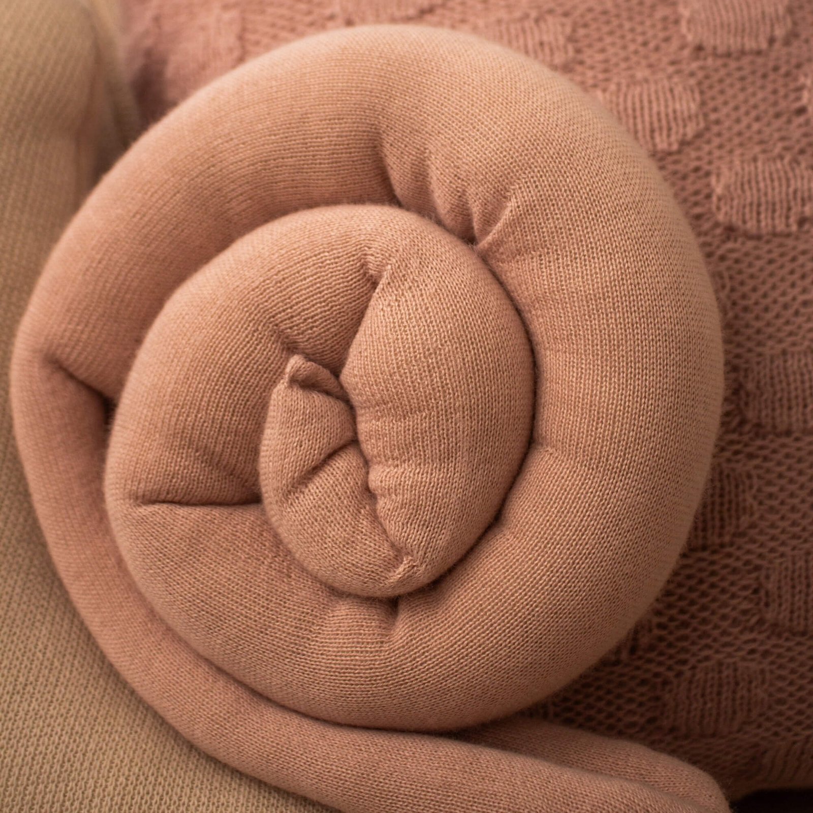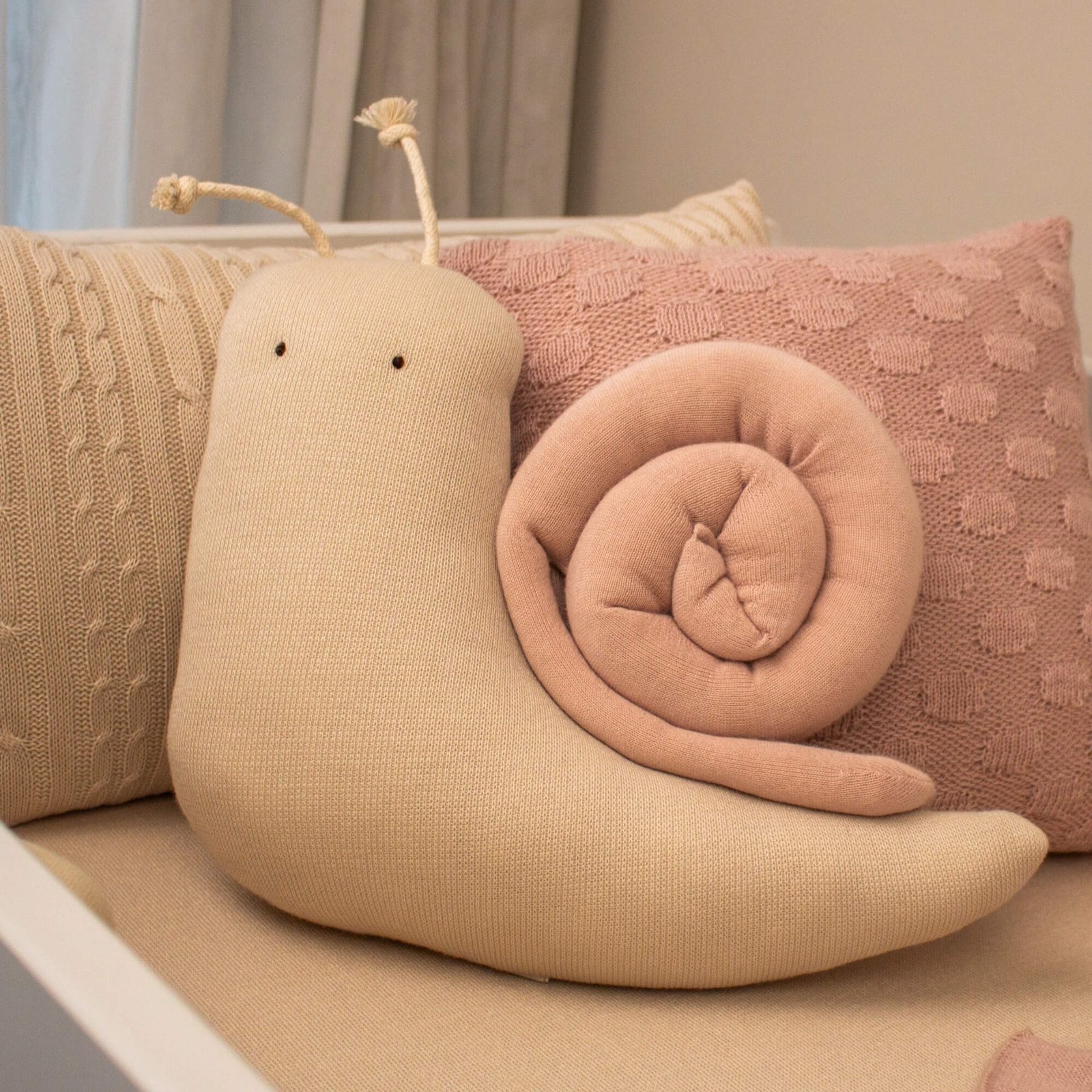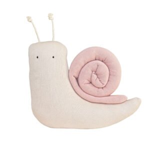 - 01 Almofada formato caramujo em tricot geada com concha em tricot rosa una – 40cm x 35cm