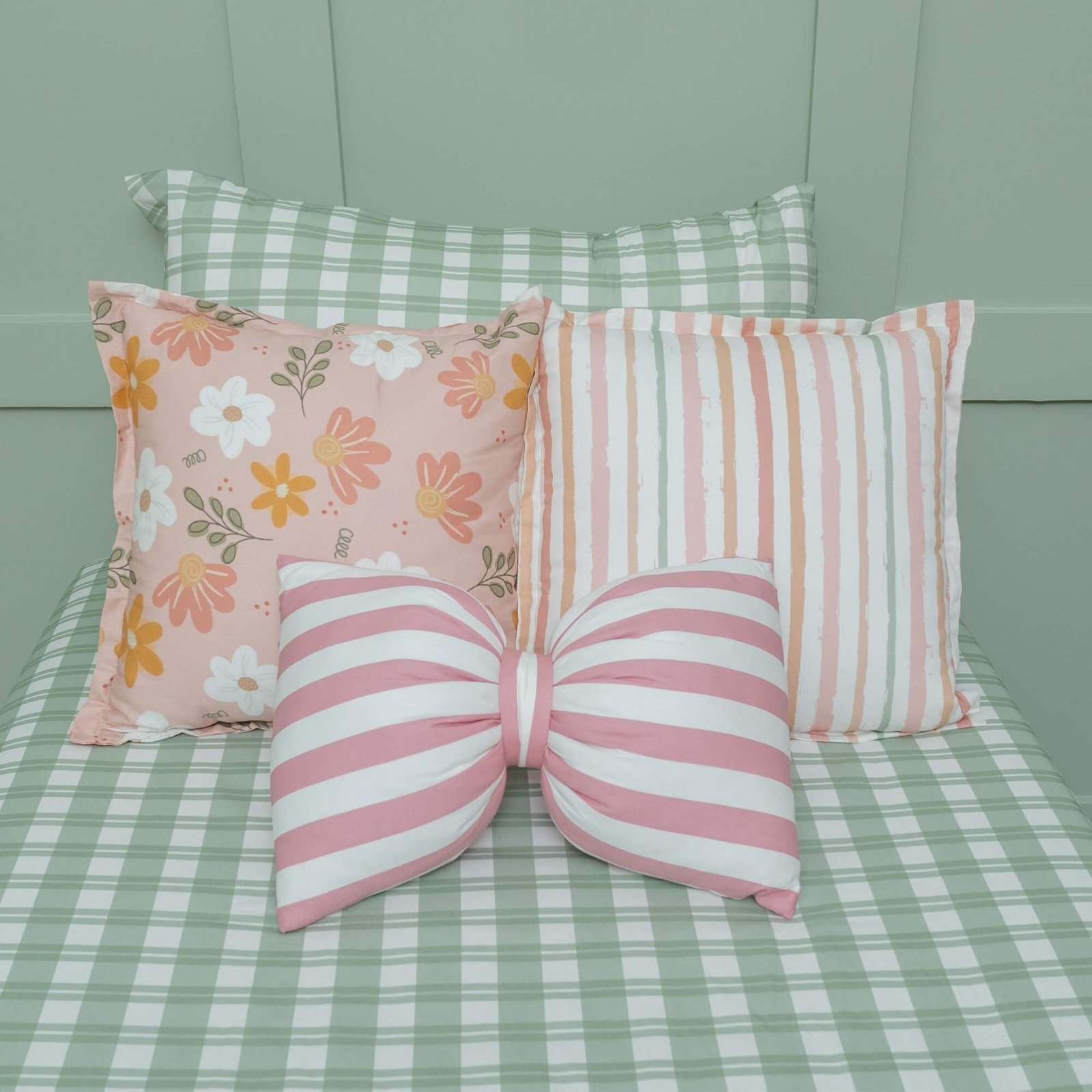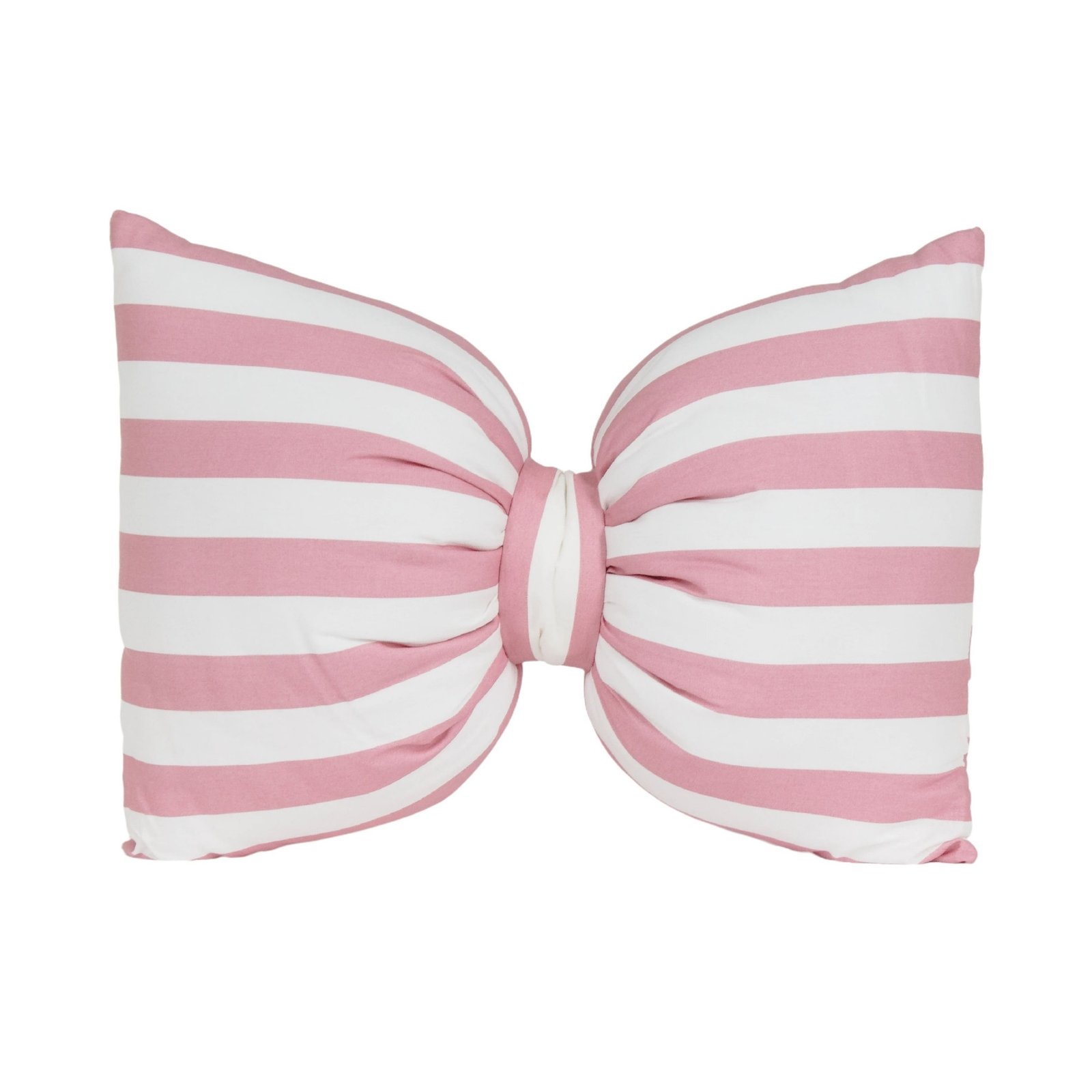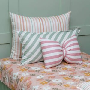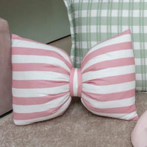 - 01 Almofada formato laço em tricoline com estampa exclusiva de listras rosa – 40cm x 30cm