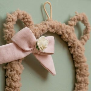 - 01 Decoração de parede formato cabeça de ursa, com estrutura em MDF e arame, revestida com alpaca. Possui laço na orelha com jacquard rosa – 22cm x 22cm