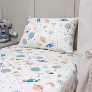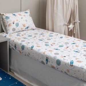 - 01 Lençol de elástico para cama de solteiro em tricoline com estampa exclusiva de planetas – 1,88m x 88cm x 20cm