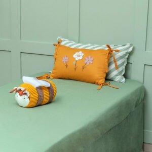 - 01 Almofada em tricoline mostarda com bordados de flores e laços nas pontas – 50cm x 35cm