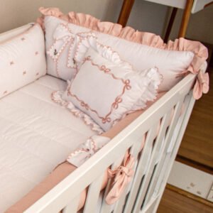 Proteção Estrutural e Segura: Todas as peças do kit de berço são desenvolvidos com um enchimento de alta performance. Eles criam uma barreira de aconchego que protege ativamente o bebê do contato com as grades. Para segurança redobrada, os protetores laterais incluem amarras que garantem uma fixação firme à estrutura do berço, assegurando um sono seguro e sem interrupções.