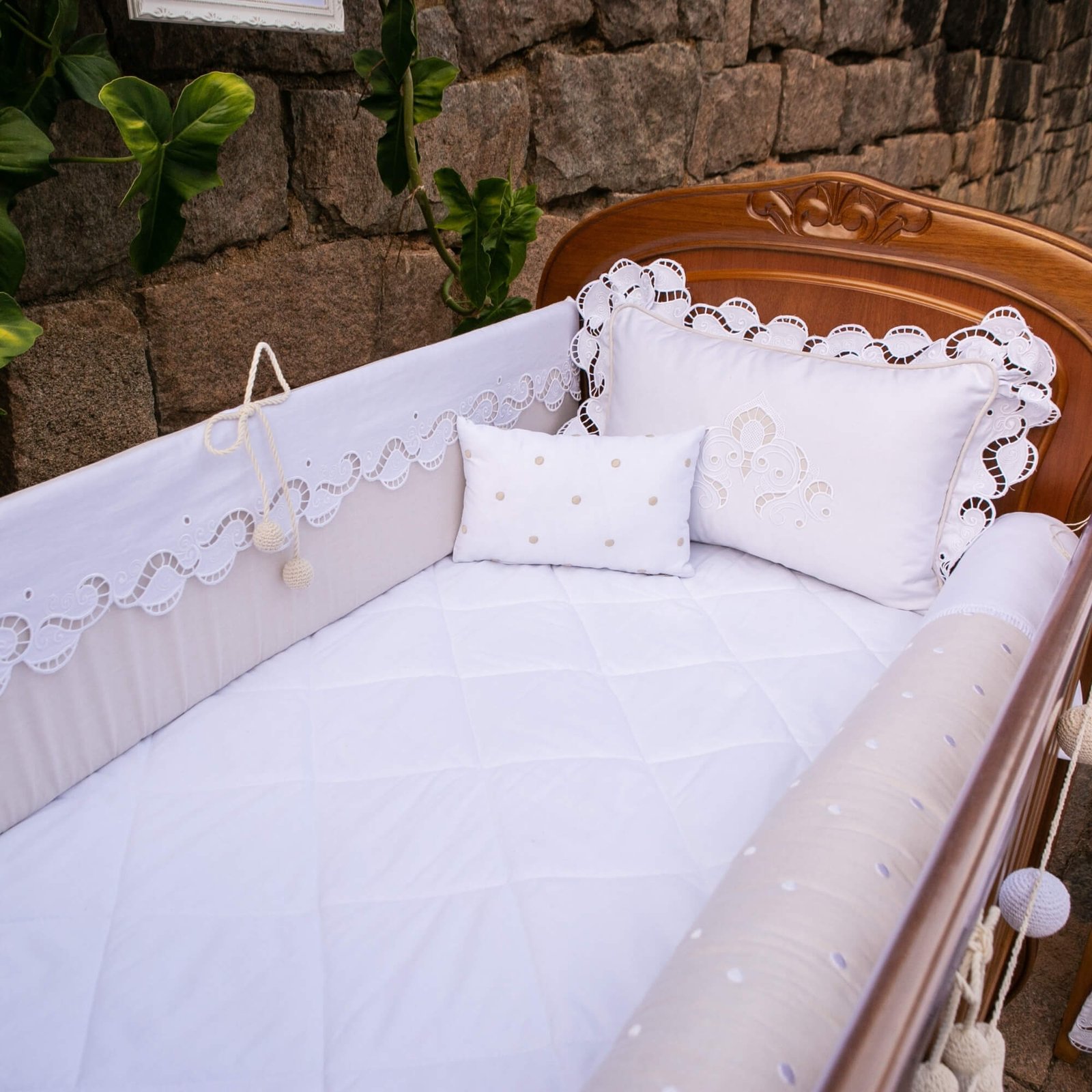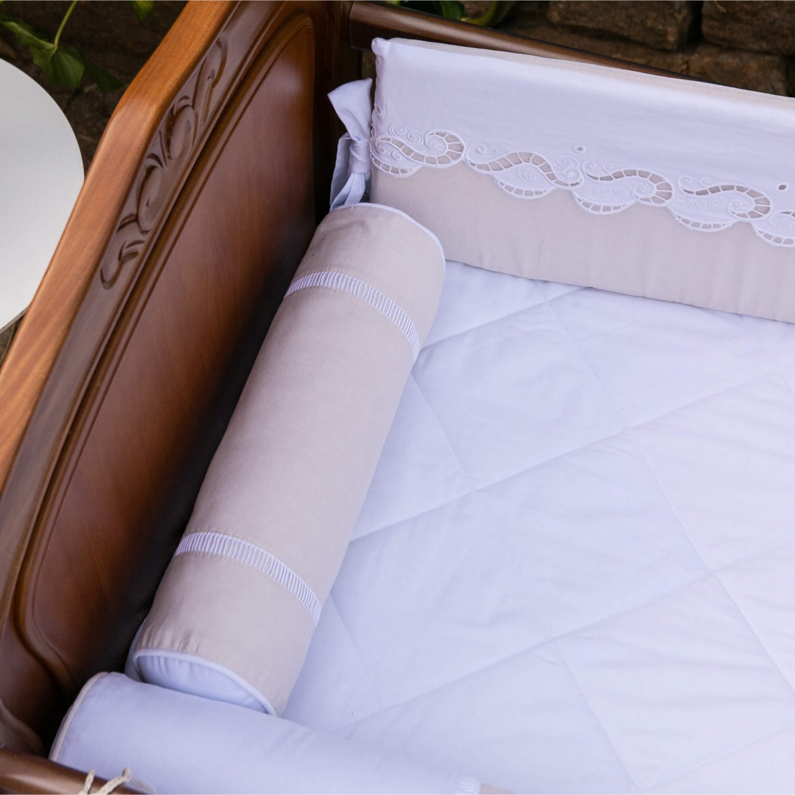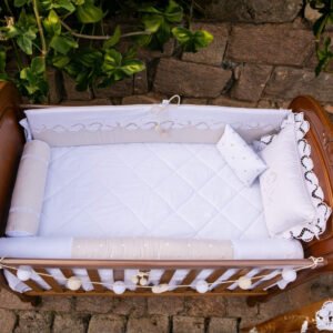 Proteção Estrutural e Segura: Todas as peças do kit de berço são desenvolvidos com um enchimento de alta performance. Eles criam uma barreira de aconchego que protege ativamente o bebê do contato com as grades. Para segurança redobrada, os protetores laterais incluem amarras que garantem uma fixação firme à estrutura do berço, assegurando um sono seguro e sem interrupções.