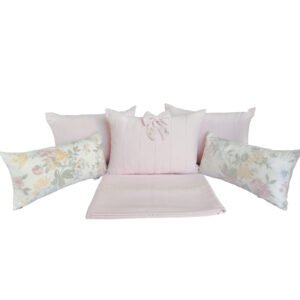 - 01 Encosto de cama em jacquard rosa com nervuras, possui detalhe de laço com pontas bordadas – 50cm x 70cm