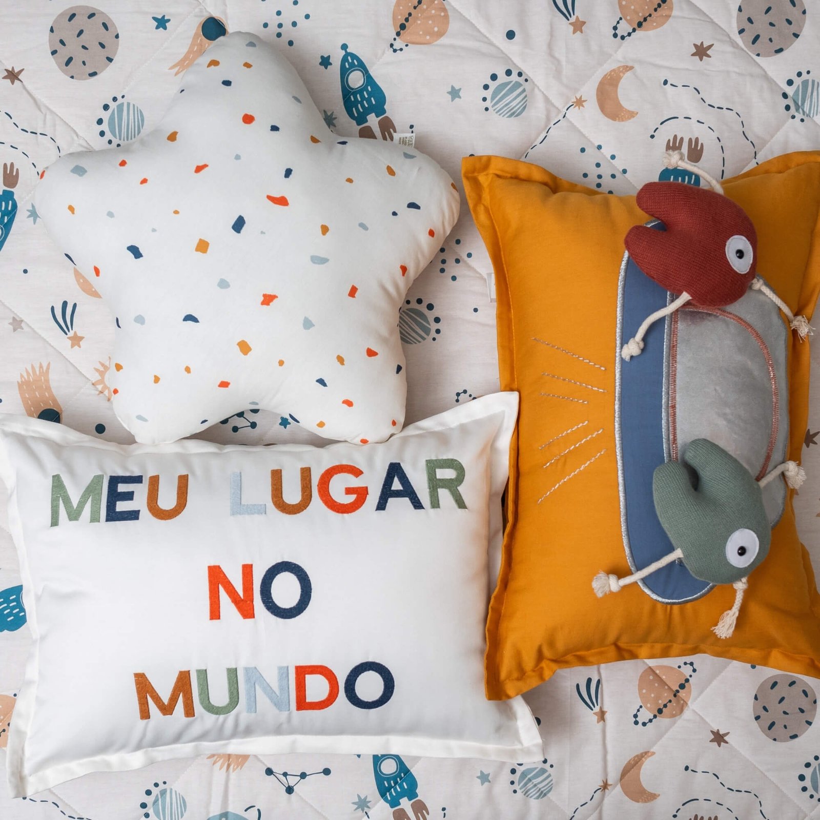- 01 Almofada formato estrela em tricoline com estampa exclusiva de asteroides – 45cm x 45cm