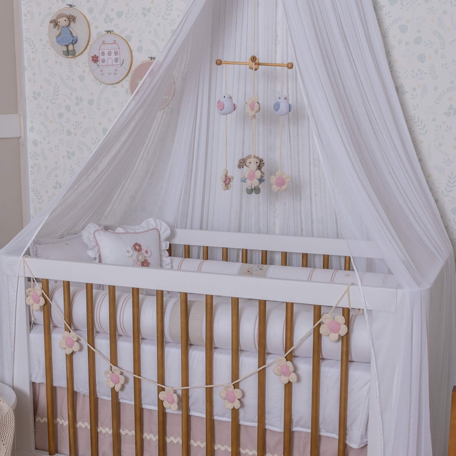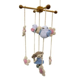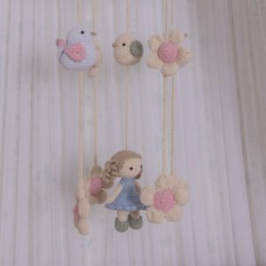 • 01 Móbile feito artesanalmente com passarinhos e bonequinha em amigurumi, possui estrutura em MDF – 45cm + 50cm cordão