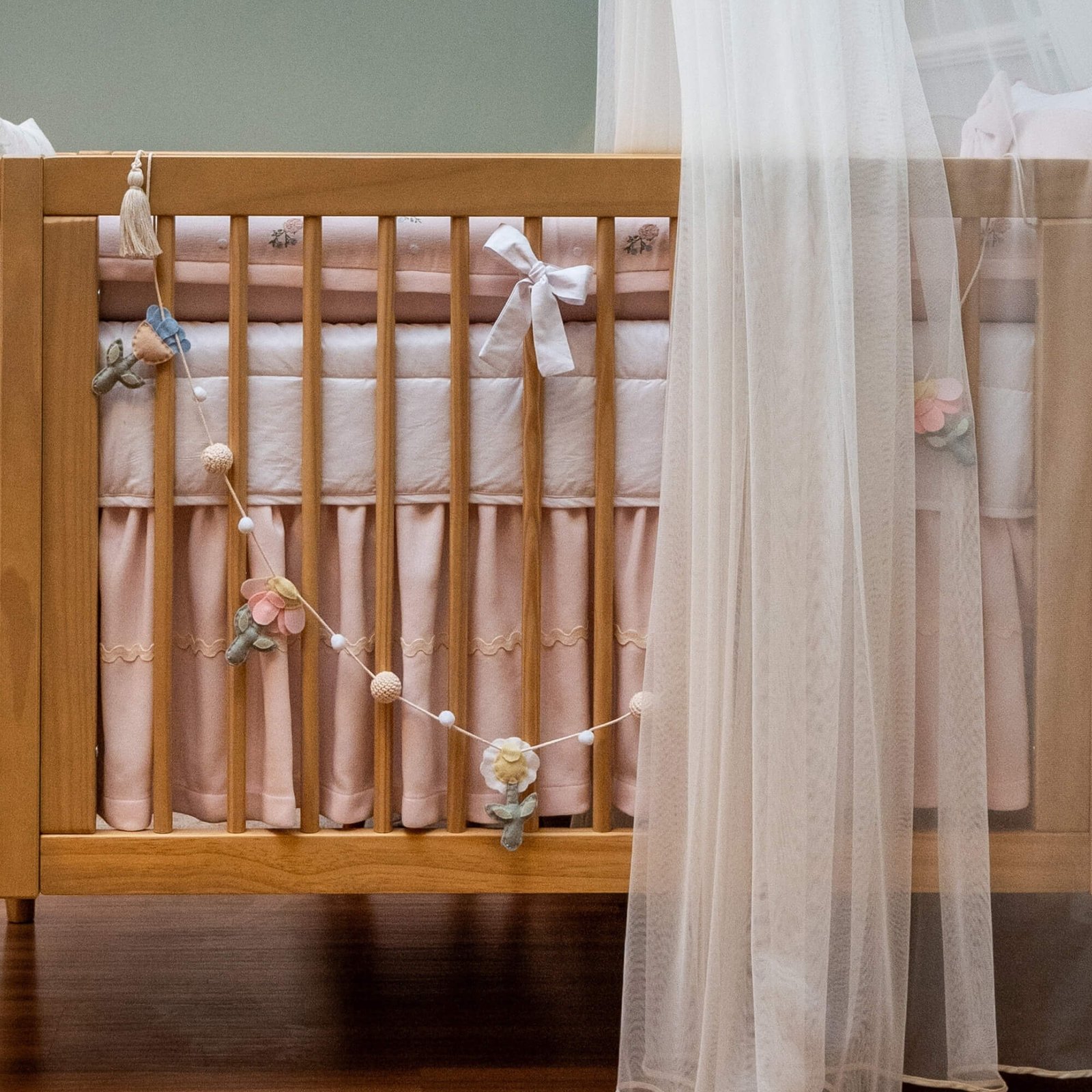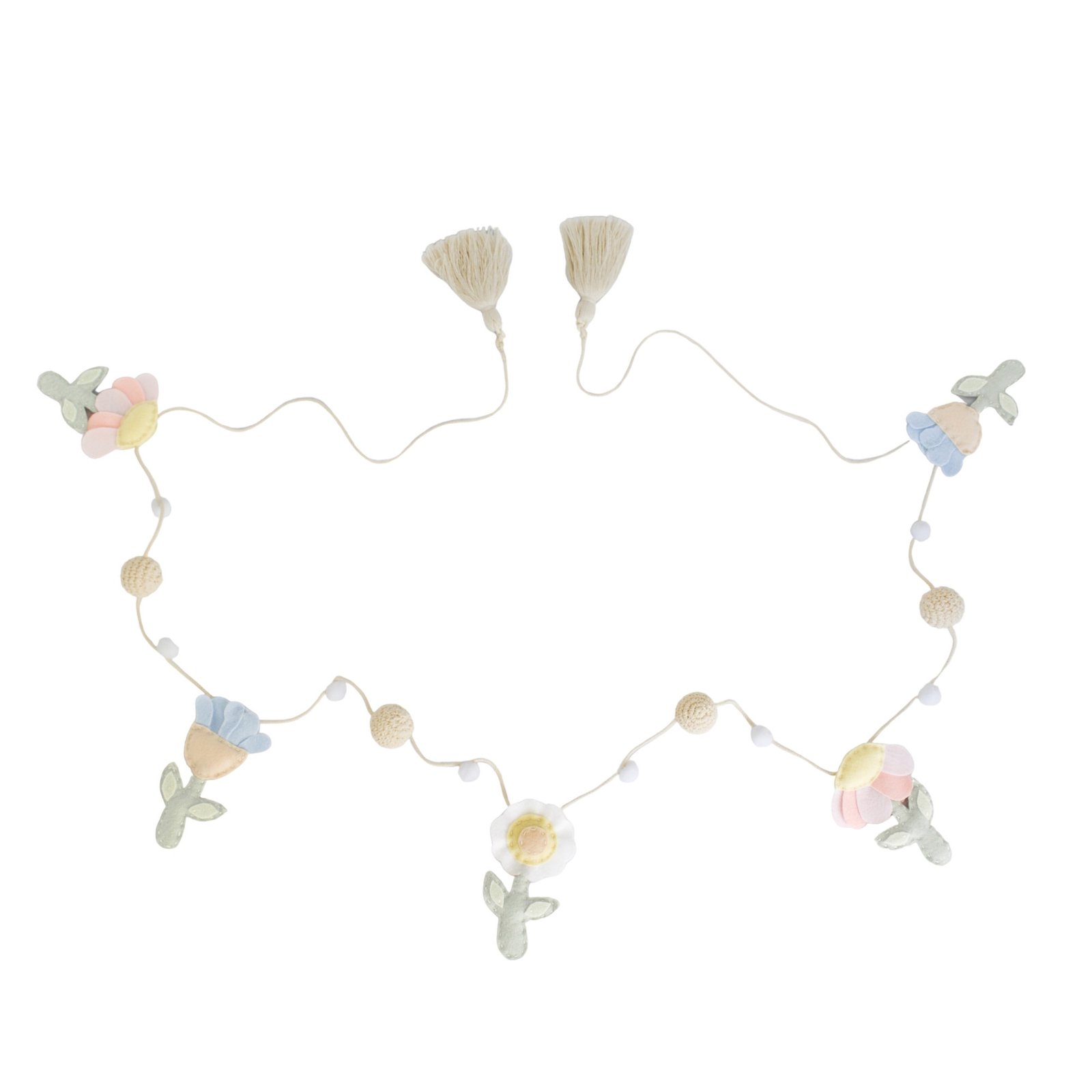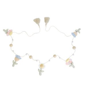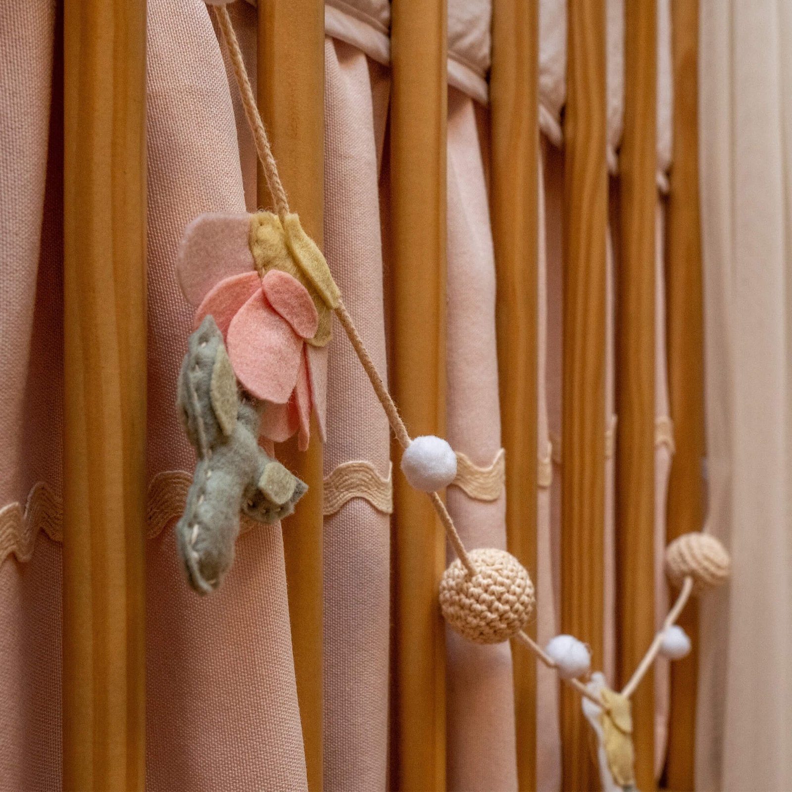 - 01 Penduricalho de berço com flores em feltro, possui bolinhas handmade e penachos nas pontas – 2m