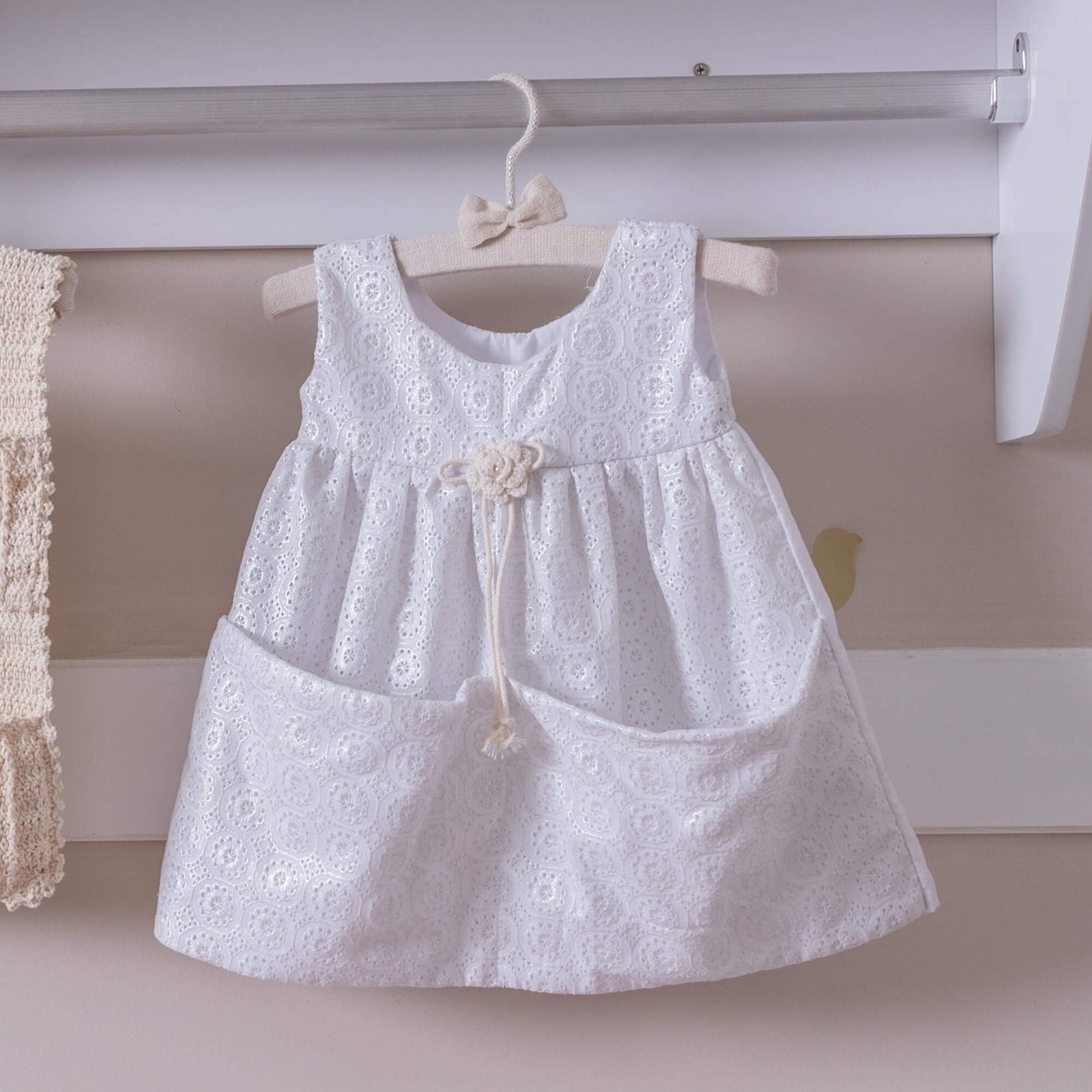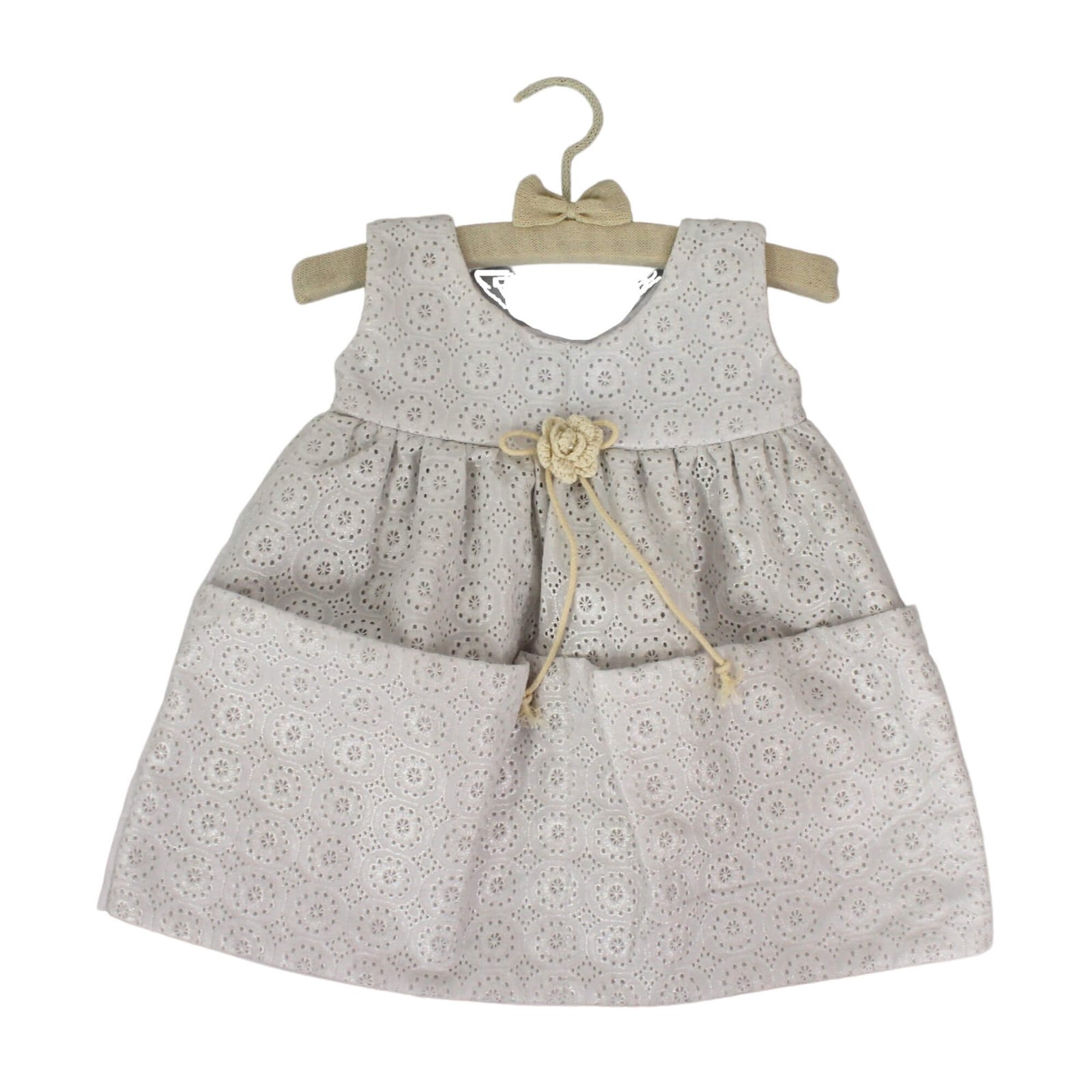 - 01 Porta treco 01 bolso formato vestido feito em lese, possui 02 bolsos frontais. Acompanha cabide revestido – 43cm x 40cm