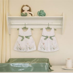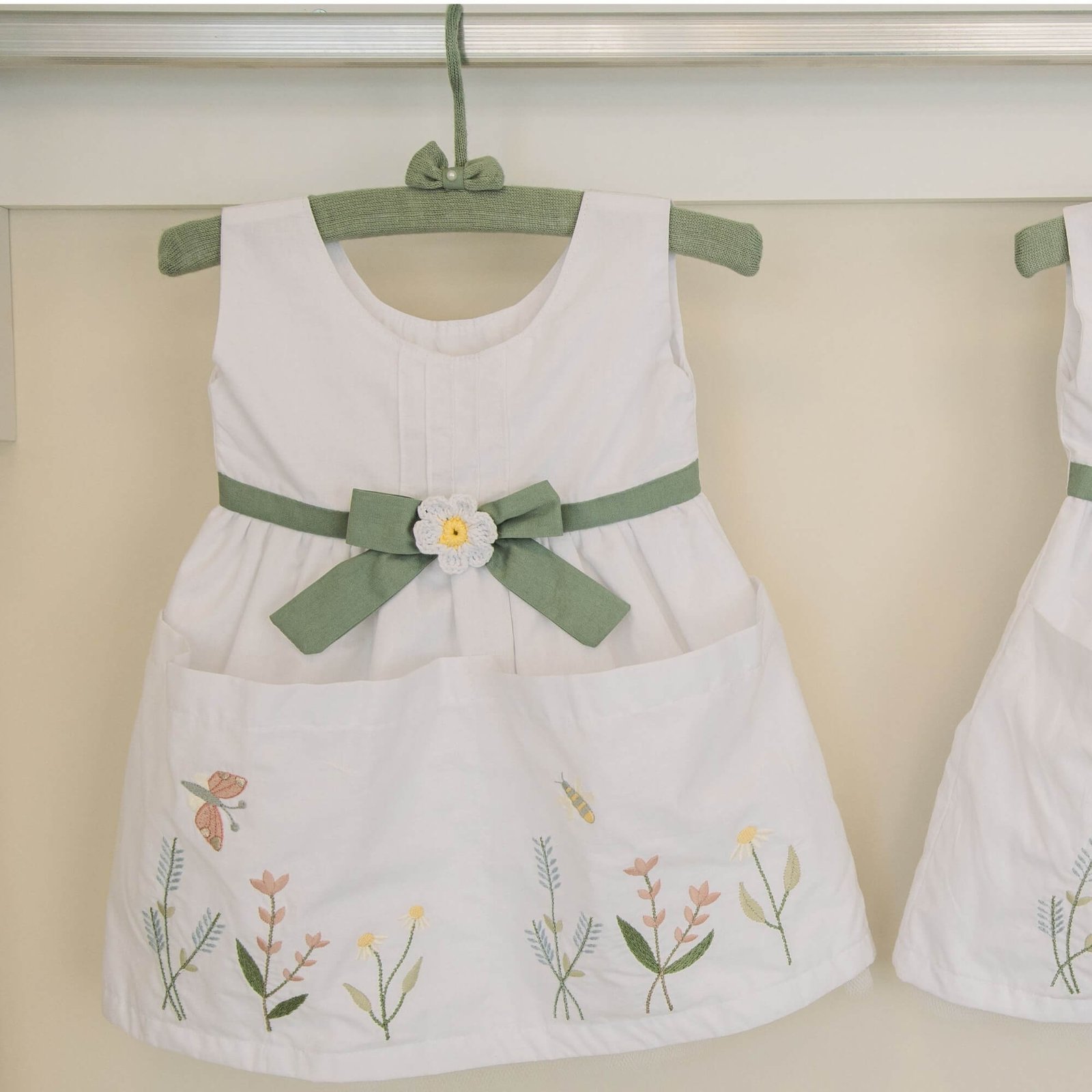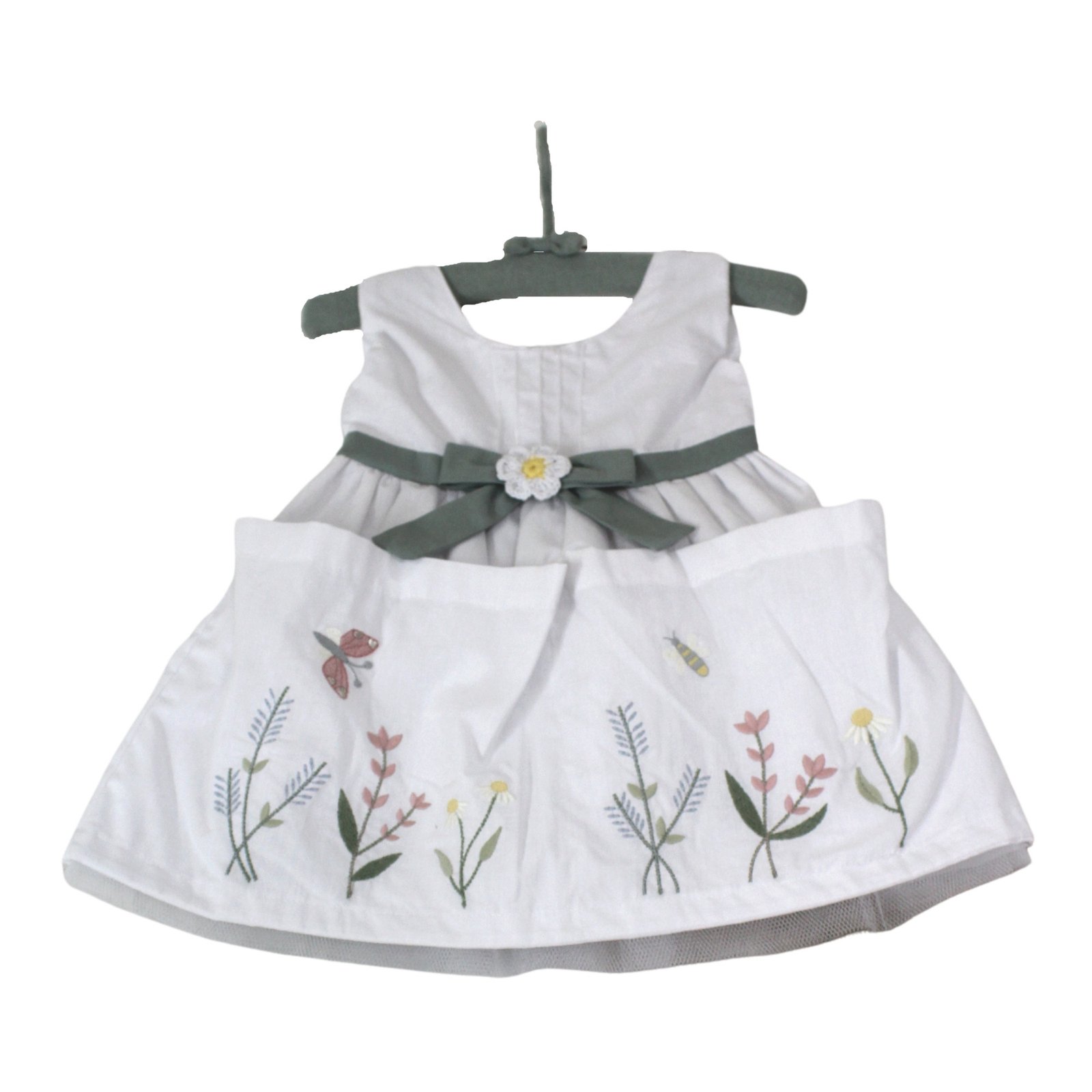 - 01 Porta treco formato vestido em percal branco com bordados de raminhos, faixas em tricoline e cabide revestido em tricot – 50cm com cabide