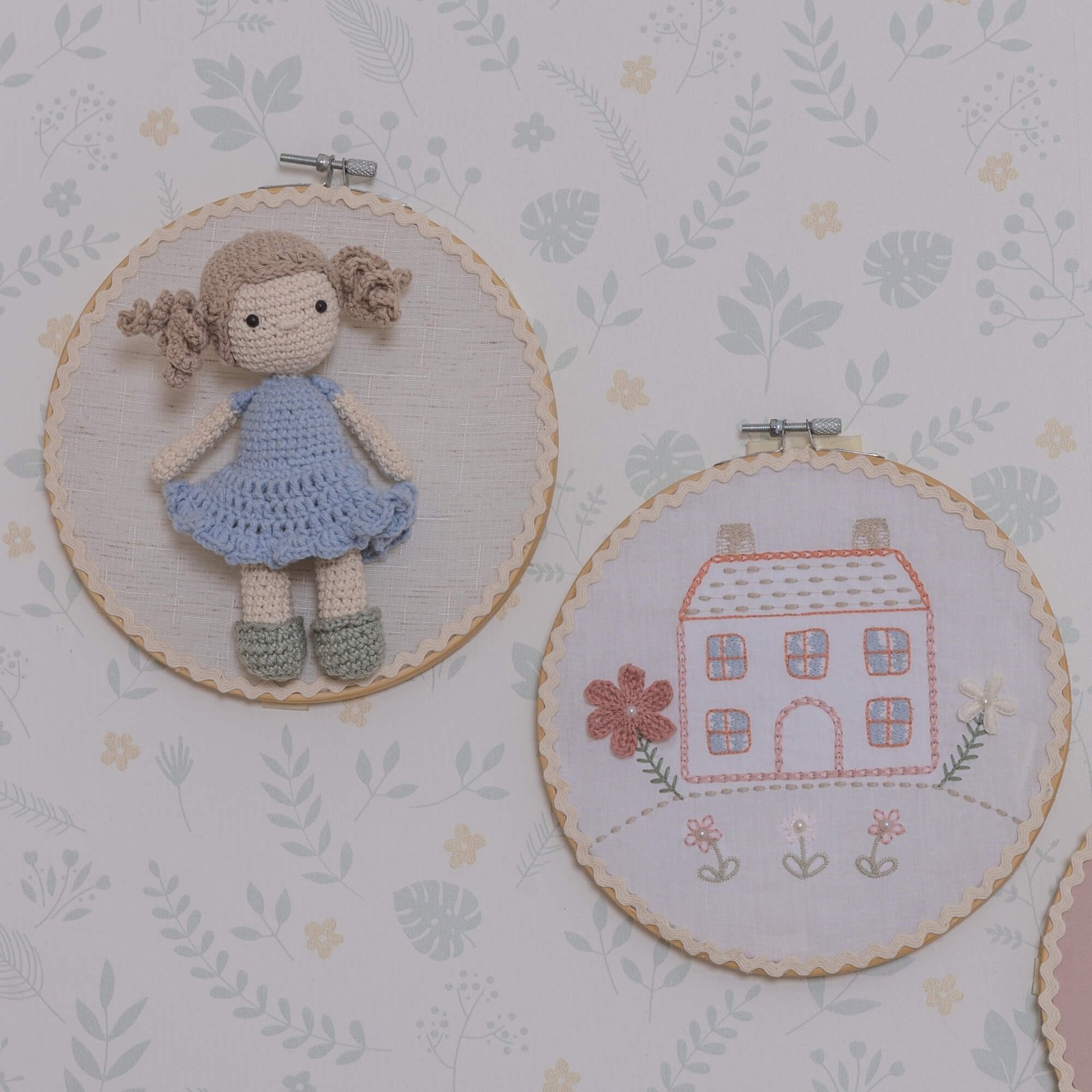 - 01 Quadro decorativo bastidor com boneca em amigurumi artesanal e contorno em sianinha – 20cm x 20cm