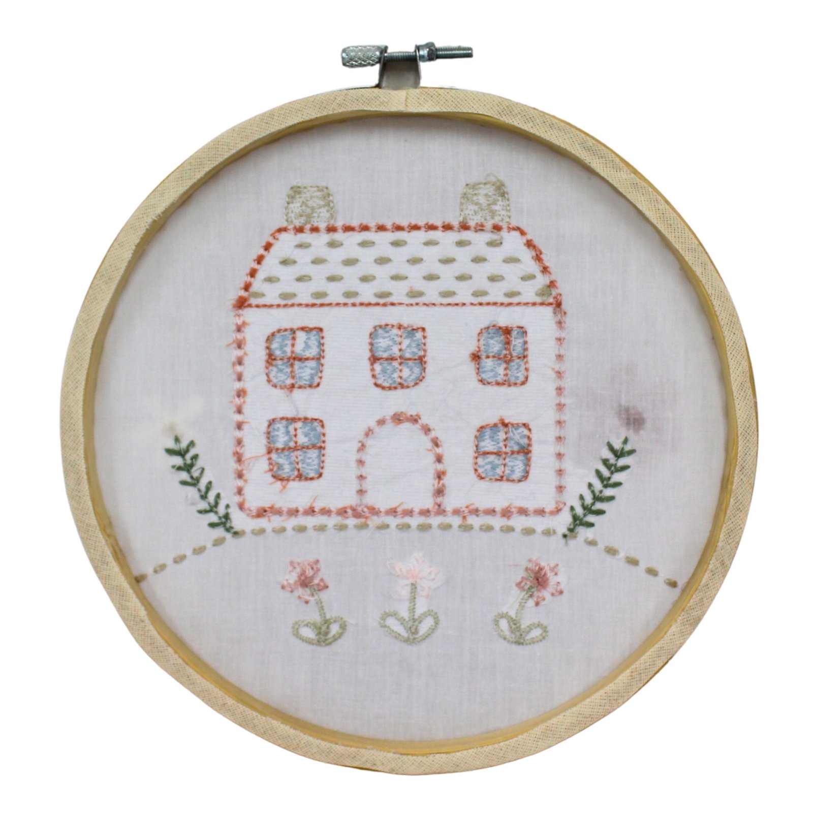 - 01 Quadro decorativo bastidor com bordado de casinha, aplicação de flor em amigurumi e contorno em sianinha – 20cm x 20cm