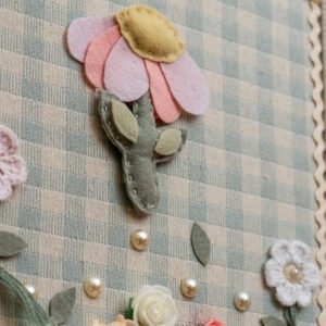 - 01 Quadro decorativo jardim de flores, com fundo em jacquard xadrez verde e flores aplicadas em feltro. Possui moldura trabalhada e contorno em sianinha – 30cm x 30cm