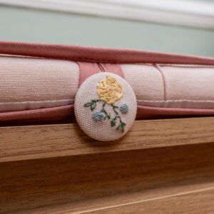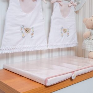 - 01 Trocador reto em jacquard rosa com nervuras, botões bordados e capa plástica com viés – 67cm x 47cm x 3cm