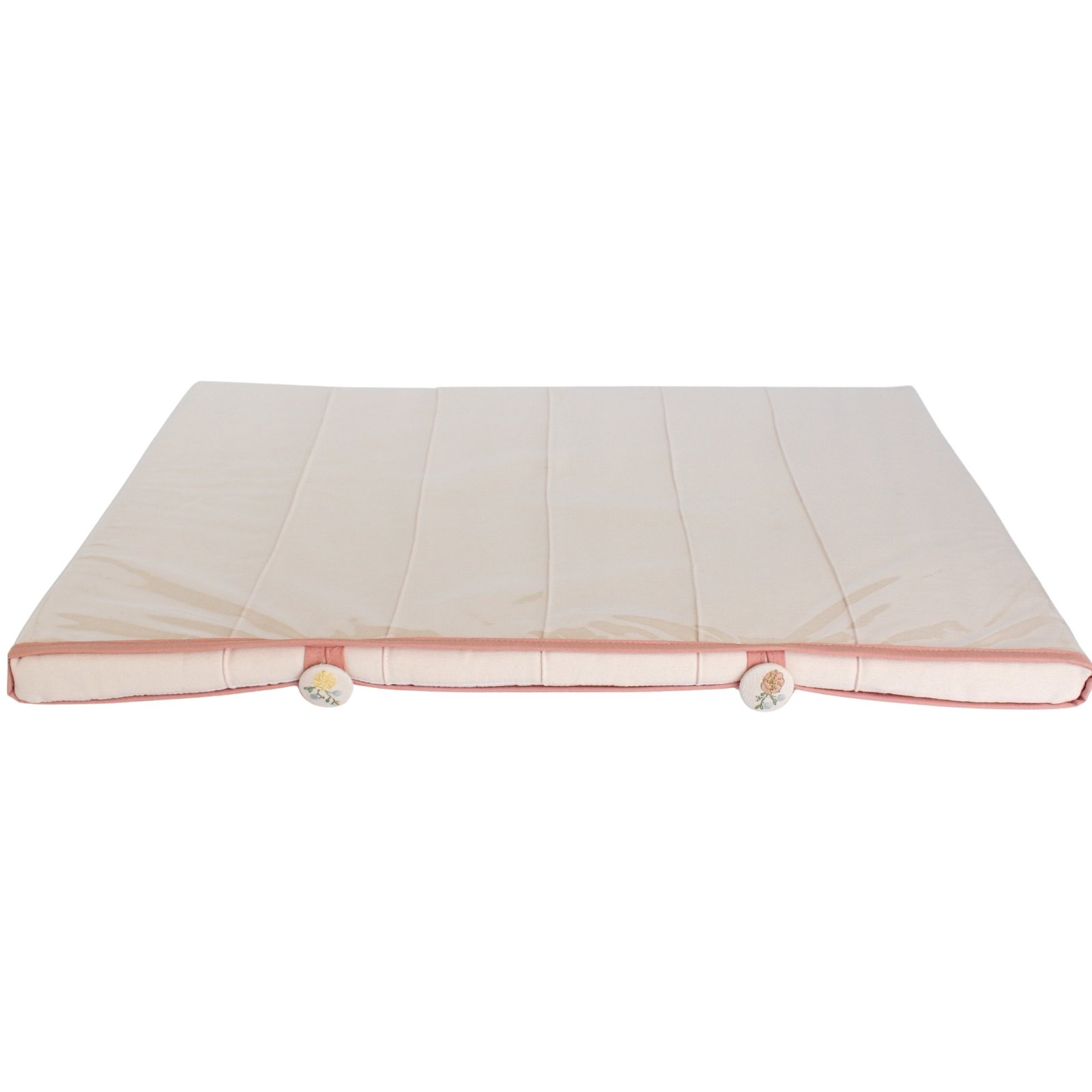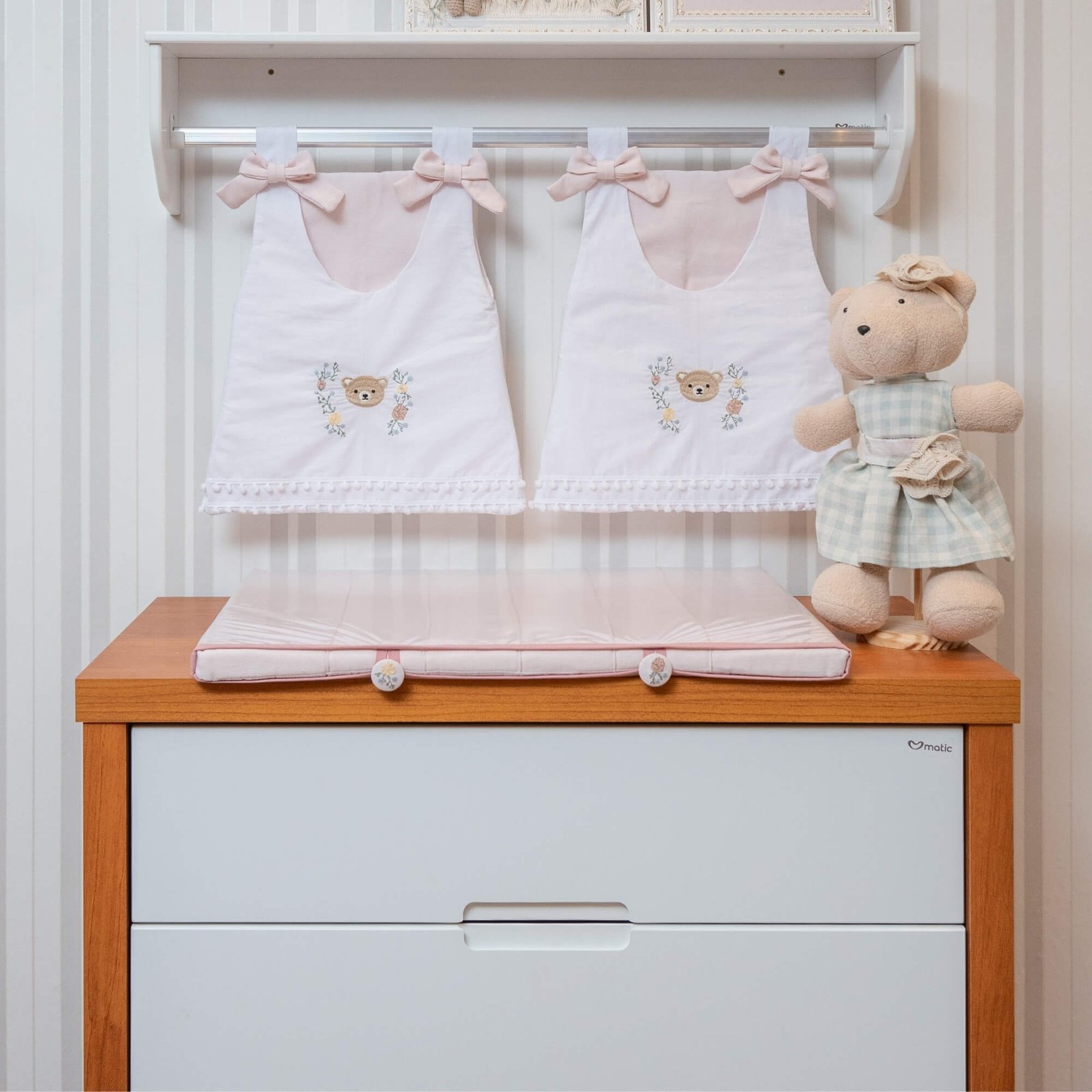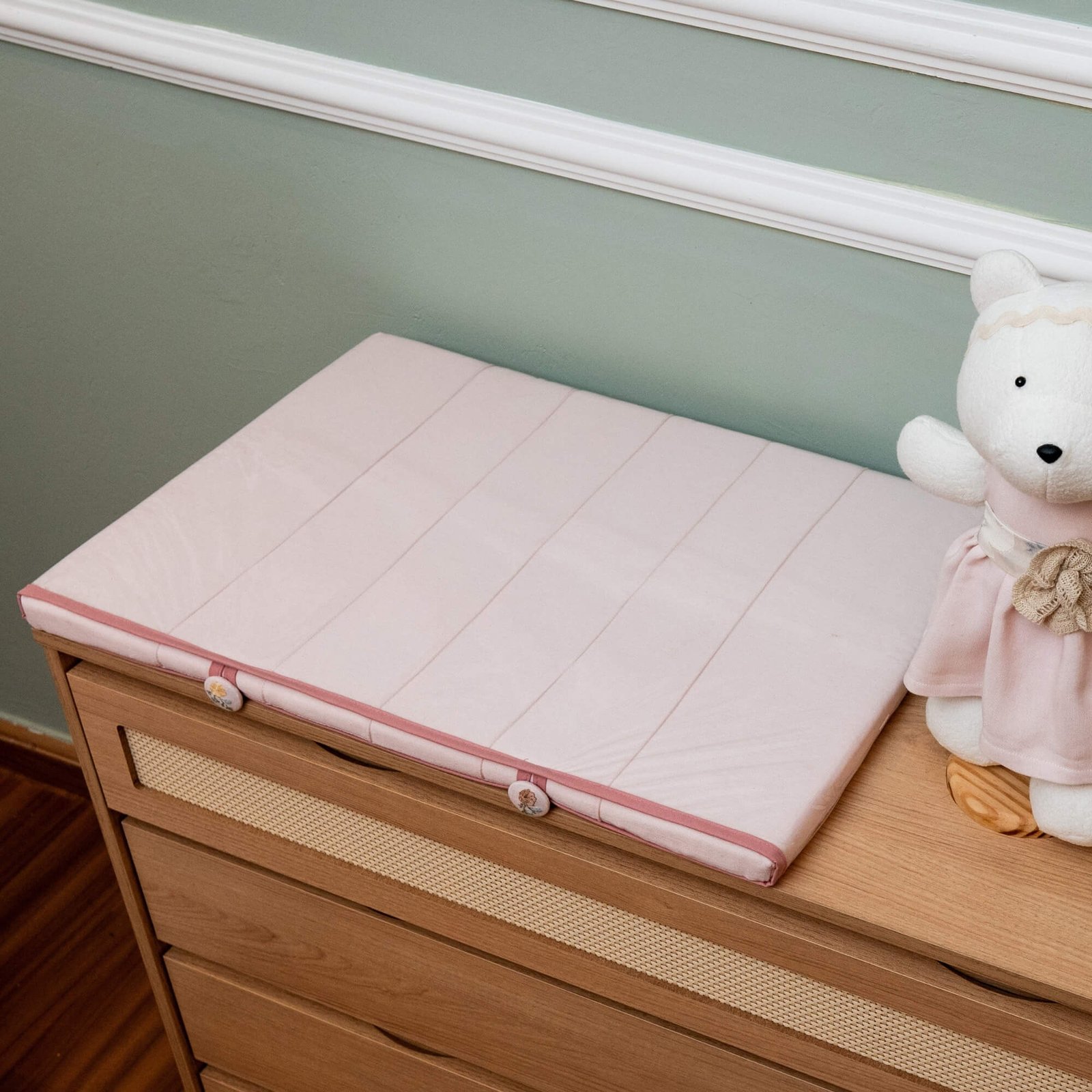 - 01 Trocador reto em jacquard rosa com nervuras, botões bordados e capa plástica com viés – 67cm x 47cm x 3cm