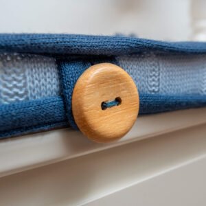 - 01 Trocador reto em tricot trança largo azul salina com viés em azul jeans e botões de madeira – 67cm x 47cm x 3cm