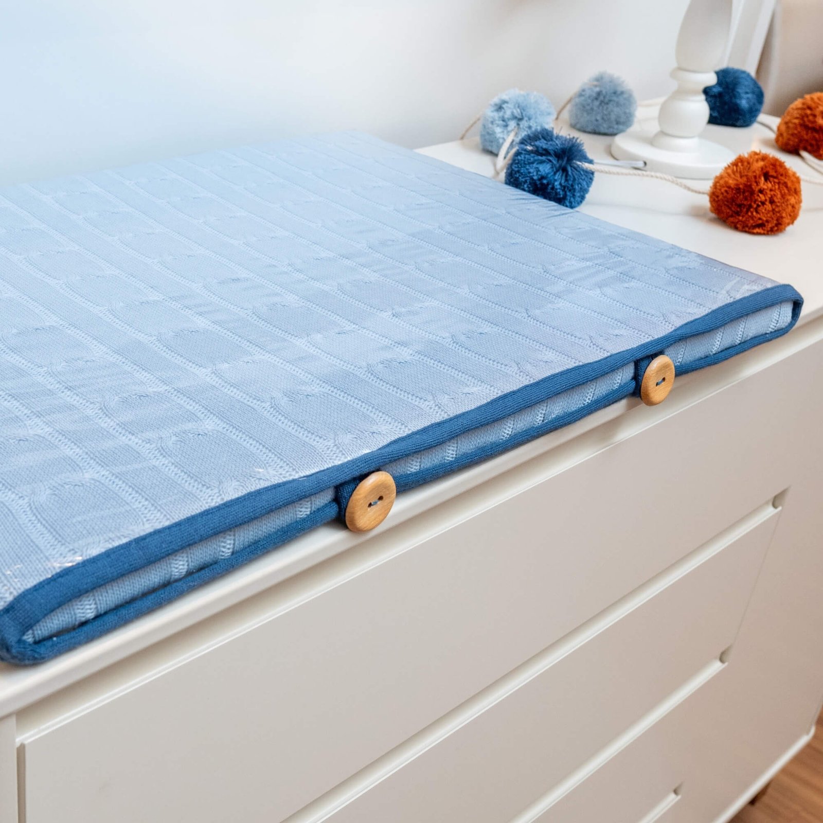 - 01 Trocador reto em tricot trança largo azul salina com viés em azul jeans e botões de madeira – 67cm x 47cm x 3cm