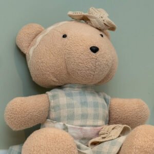 • 01 Ursa de nicho decorativa feita em melton bege com vestido em jacquard xadrez. Possui flor bordada na cabeça – 45cm